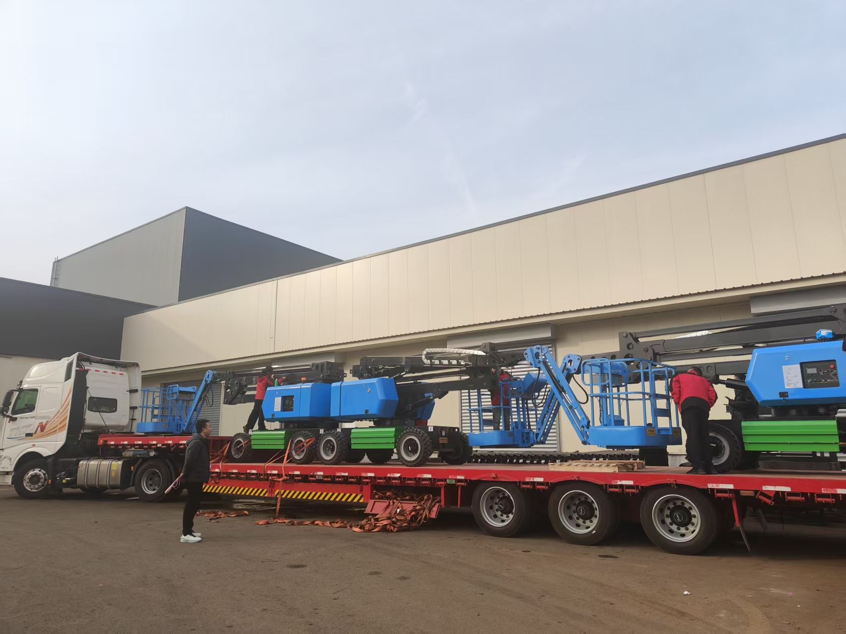 今日,山東升降機(jī)廠家的三臺(tái)14米曲臂式升降平臺(tái)整裝待發(fā),如三位身披鎧甲的巨人,即將踏上新的征途。