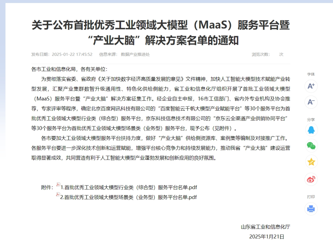 2025年的第一封喜報(bào)丨天意機(jī)械榮獲山東省首批優(yōu)秀工業(yè)領(lǐng)域大模型服務(wù)平臺(tái)