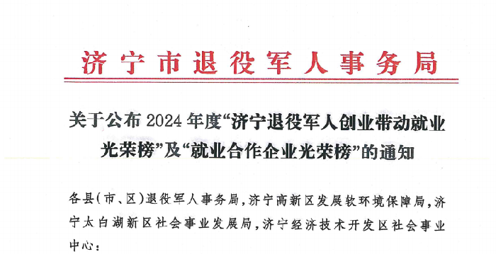 濟(jì)寧市退役軍人事務(wù)局公布2024年度“濟(jì)寧退役軍人創(chuàng)業(yè)帶動(dòng)就業(yè)光榮榜”及“就業(yè)合作企業(yè)光榮榜”,其中,山東天意機(jī)械股份有限公司位列“濟(jì)寧退役軍人就業(yè)合作企業(yè)光榮榜”。